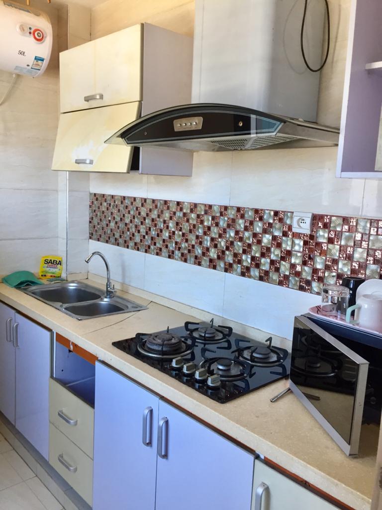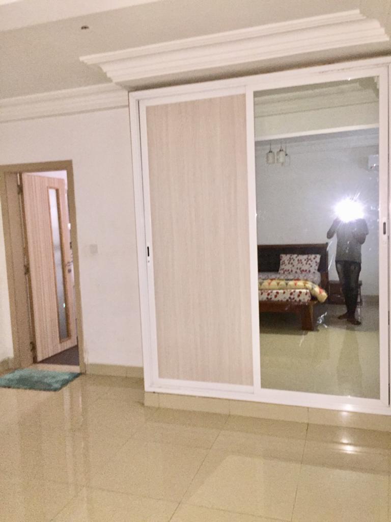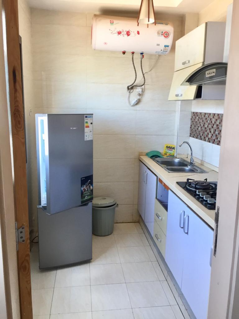 Une chambre avec salle de bain, climatisation, salon, cuisine équipée ( four, micro onde, réfrigérateur, etc.,), wifi, tv canal, femme de ménage, gardiennage.