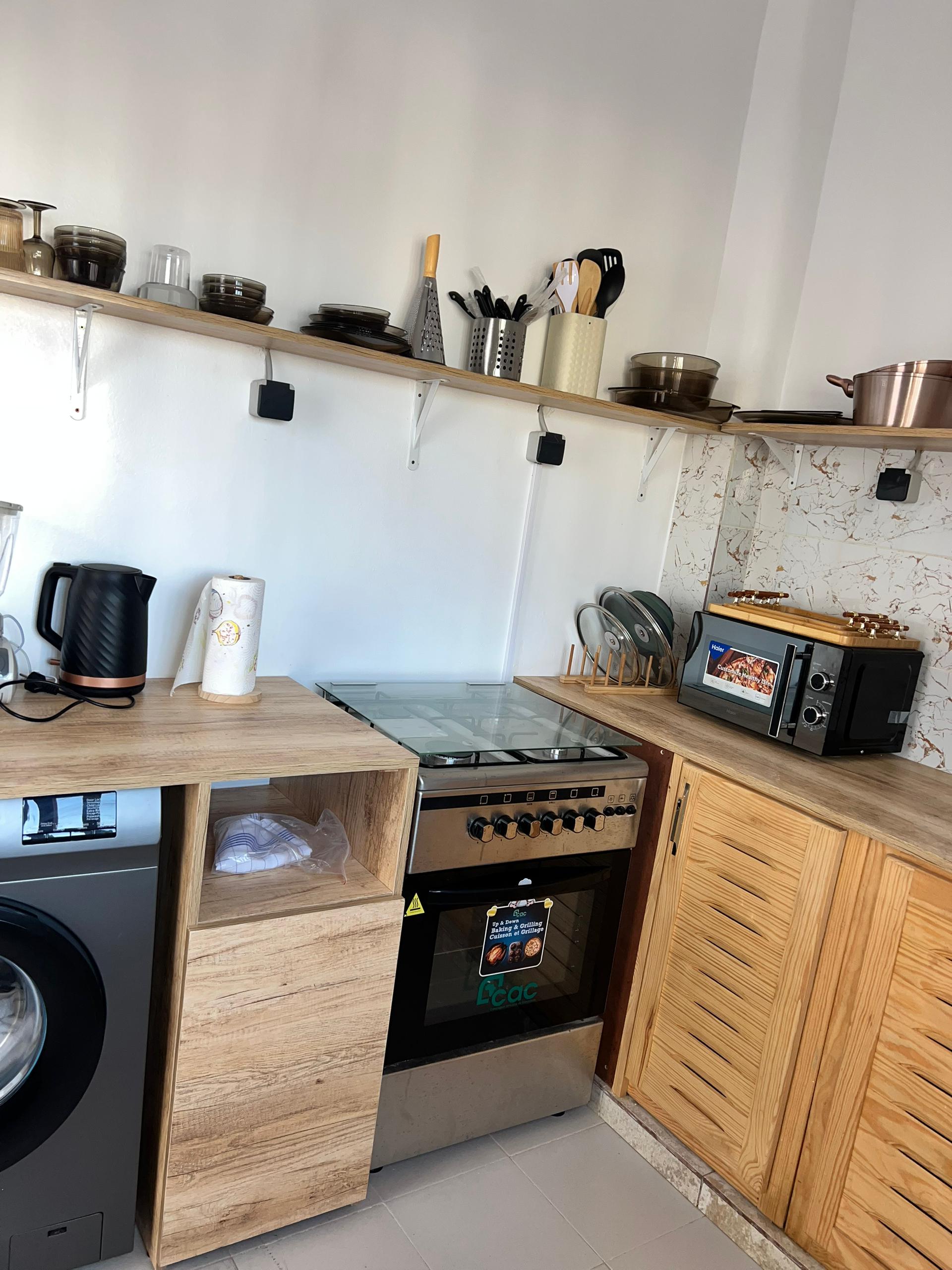 Cuisine équipée et meublée (réfrigérateur, plaques, four/micro-ondes, rangements)