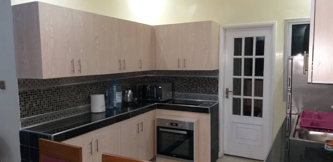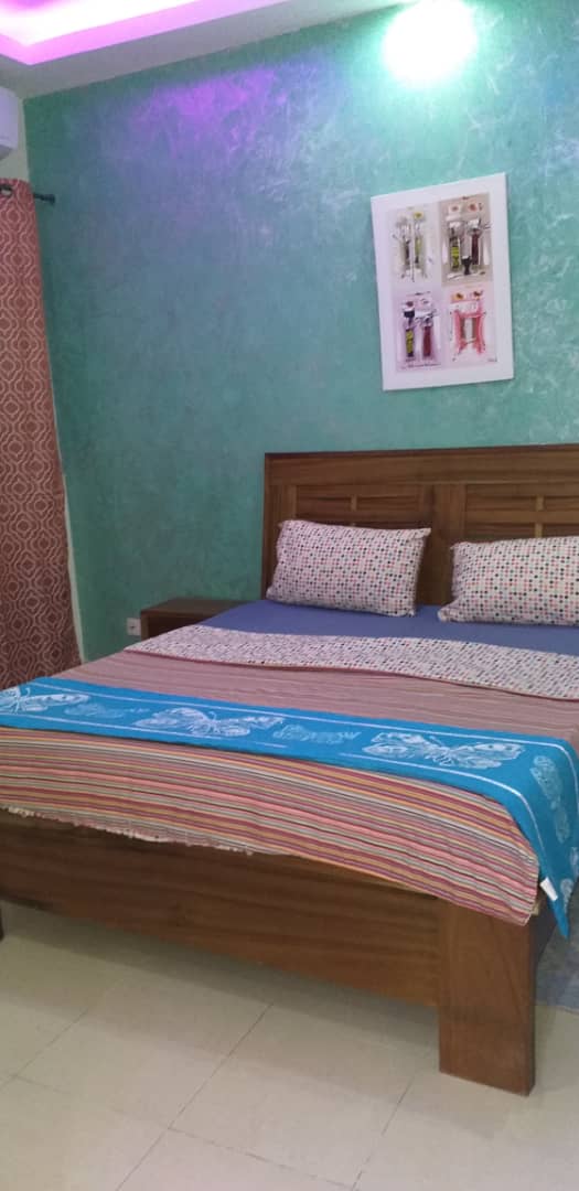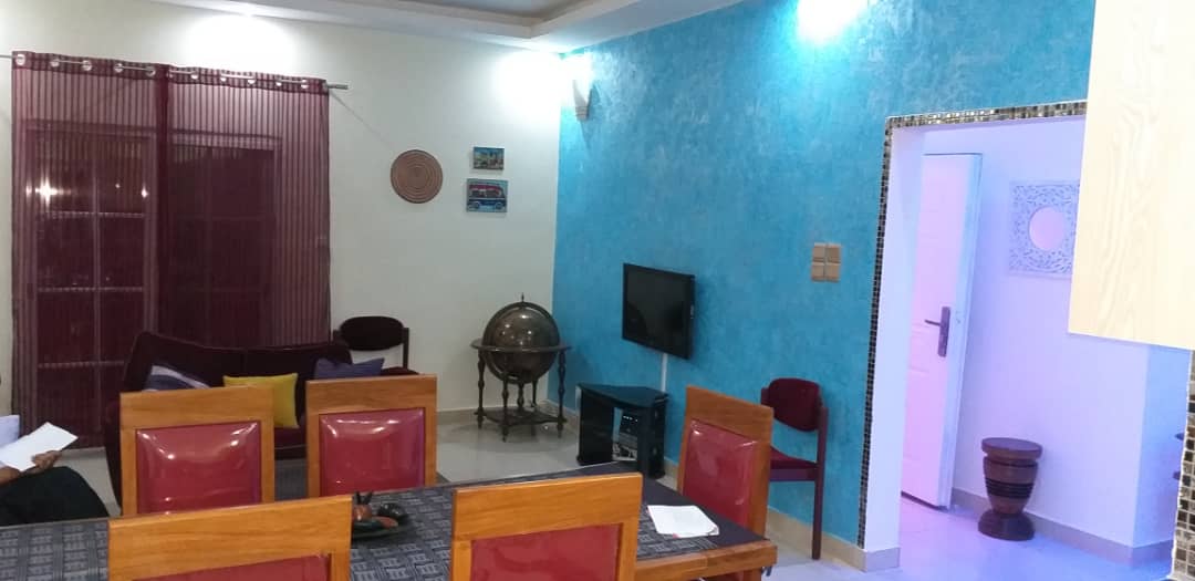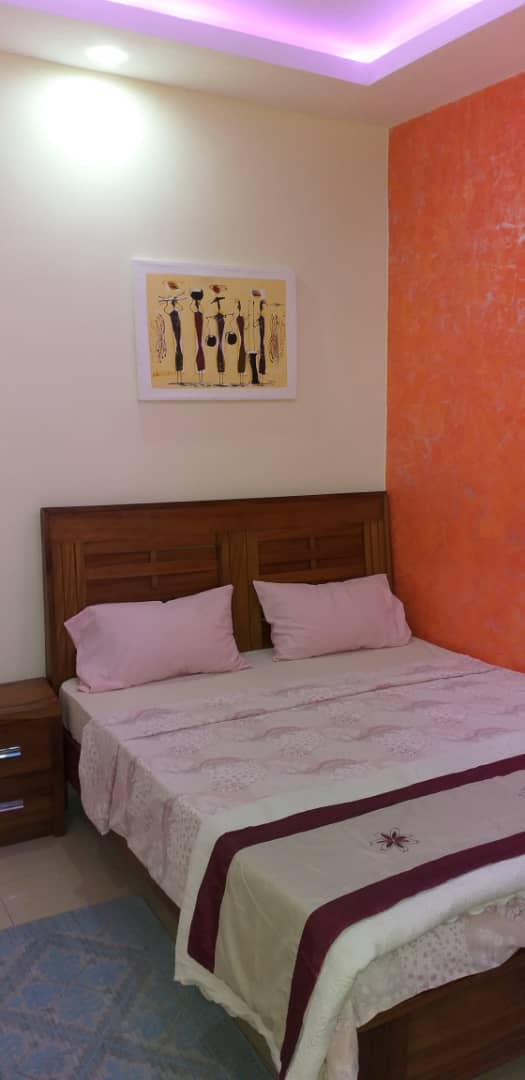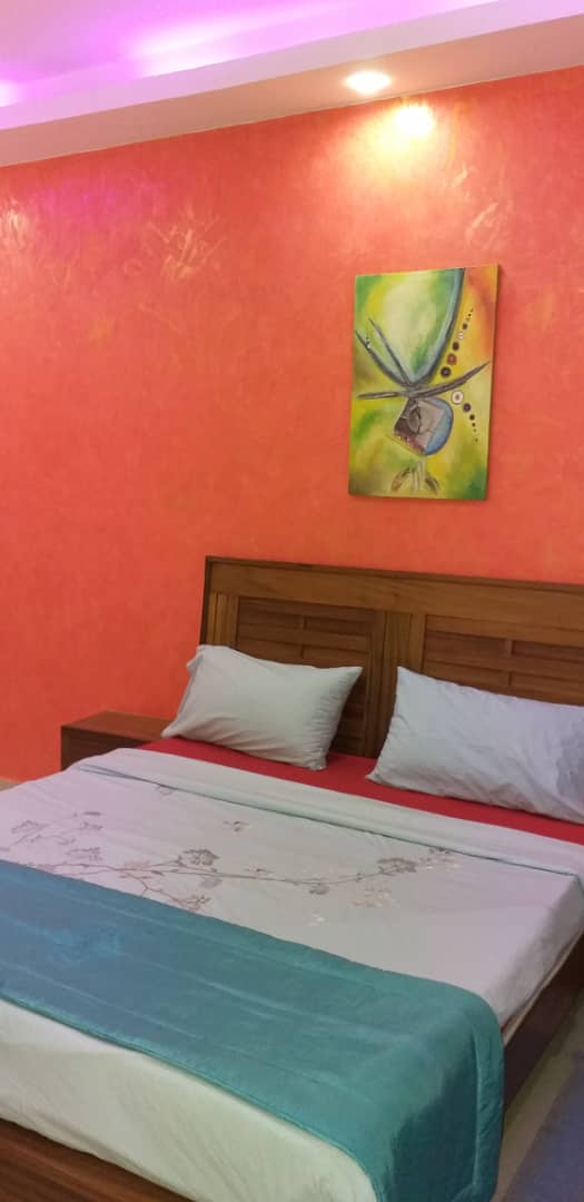 Une chambre avec salle de bain, climatisation, salon, cuisine équipée ( four, micro onde, réfrigérateur, etc.,), wifi, tv canal, femme de ménage, gardiennage.