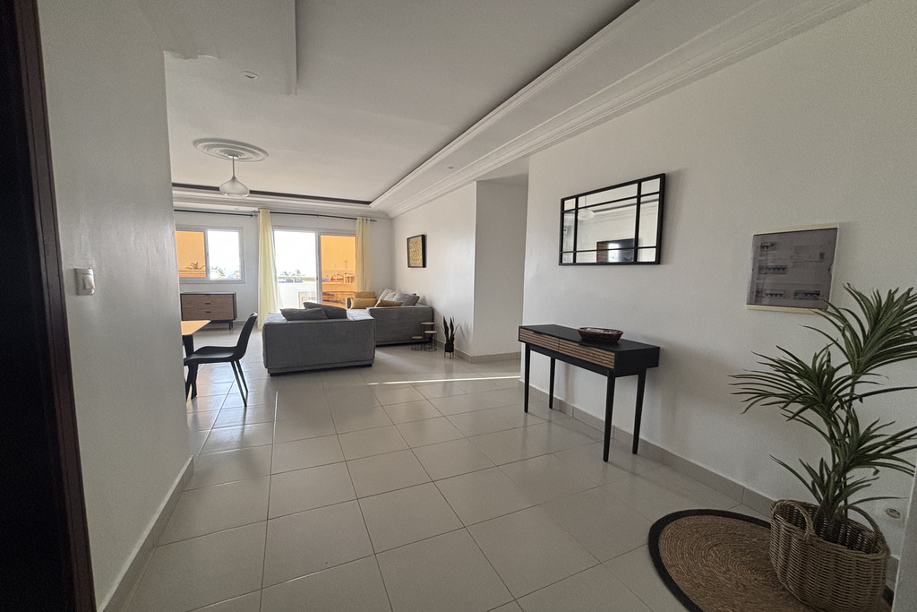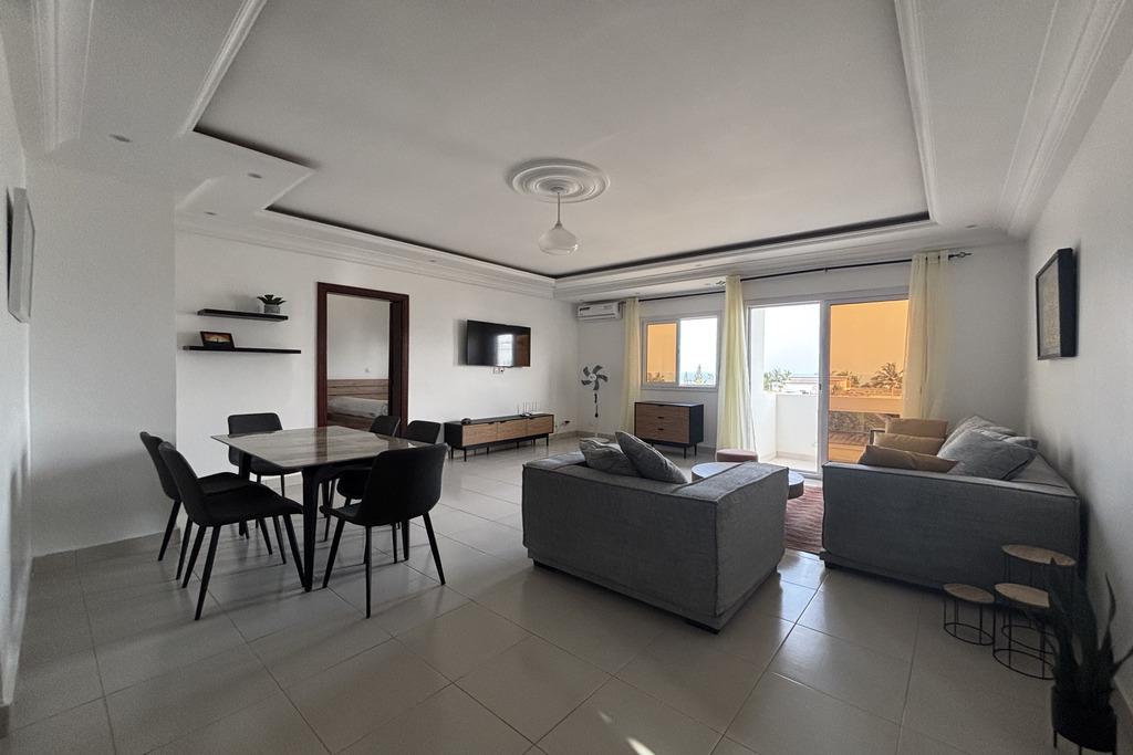 Bel appartement meublé de 3 chambres, sur la Corniche des Almadies, combinant confort et localisation idéale. Vue mer, piscine, ascenseur, gardiennage 24/7, concierge et groupe électrogène.
