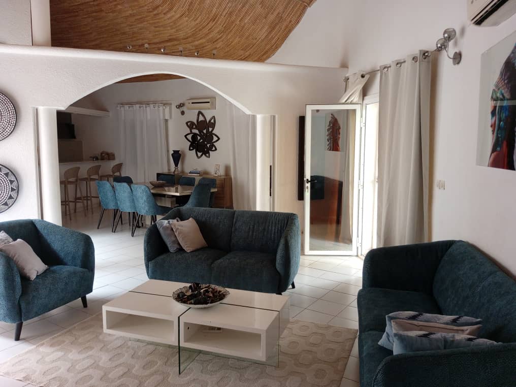 Découvrez cette splendide villa entièrement meublée, située dans la Résidence Popenguine, un cadre sécurisé et verdoyant à Saly, idéal pour un séjour confortable ou une location longue durée.