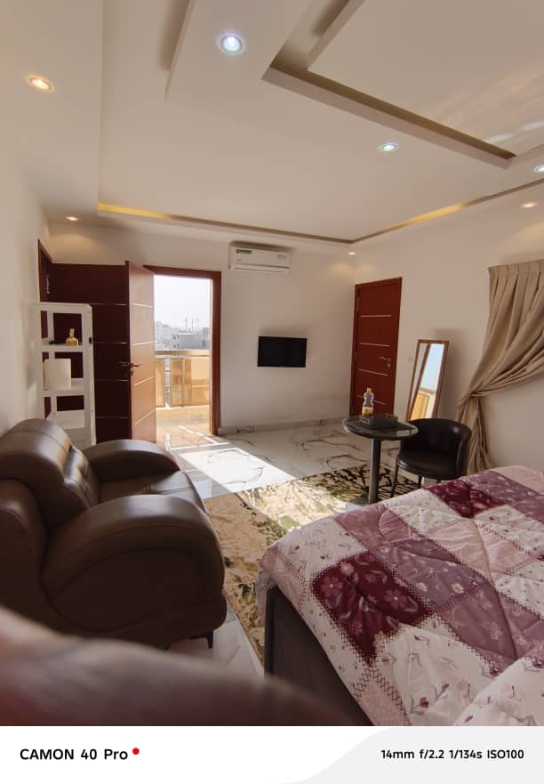 ? Ngor Almadies magnifique studio meublé vue sur mer ? à louer chambre salle de bains salon cuisine terasse privé et toilettes visiteur au 7ème étage avec ascenseur.